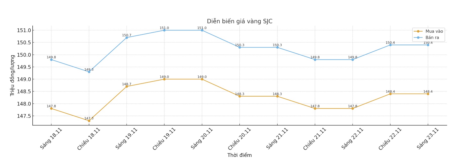 At the end of the trading session on November 23, Saigon Jewelry Company SJC listed the price of SJC gold bars at 148.4 million VND/tael for buying and 150.4 million VND/tael for selling, down 600,000 VND/tael in both directions compared to November 16.