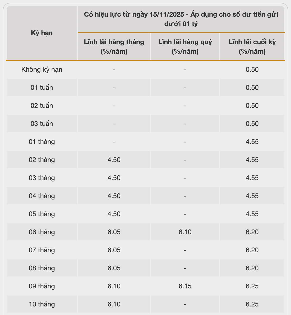 Vikki Bank is listing the highest interest rate for 13-month deposits at 6.4%/year when customers deposit money online and receive interest at the end of the term. For other terms, customers list interest rates at 0.5-6.4%/year.
