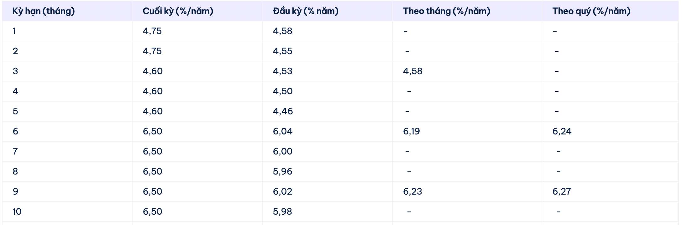 BacABank is listing the highest interest rate for 13-month deposits at 6.4%/year when customers deposit electronic savings and receive interest at the end of the term. Currently, BacABank is listing the highest interest rate that this bank is applying at 6.5% for a term of 18-36 months.