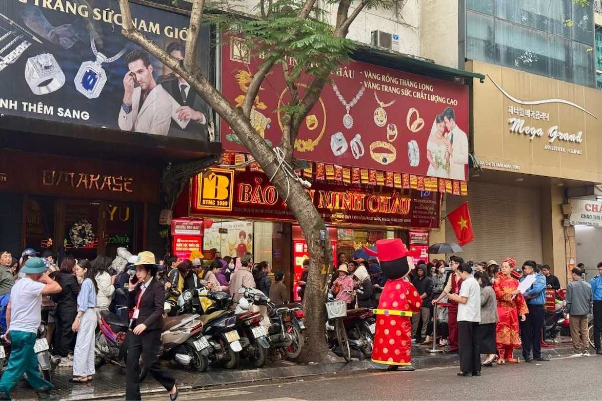 On the morning of February 24, recorded on some gold business streets in Hanoi, many people were present early to queue to buy gold before the God of Wealth Day. The weather was rainy but the number of people waiting outside the stores still gradually increased over time.