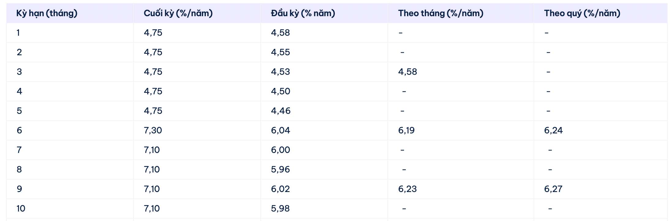 Cake by VPBank is listing the highest interest rate for a 12-month term at 7.1%/year when customers receive interest at the end of the term. Customers receiving interest at the beginning of the term, by month, by quarter receive interest rates of: 6%; 6.27%; 6.31% respectively. Currently, Cake by VPBank lists the highest interest rate at 7.3% for a 6-month term.