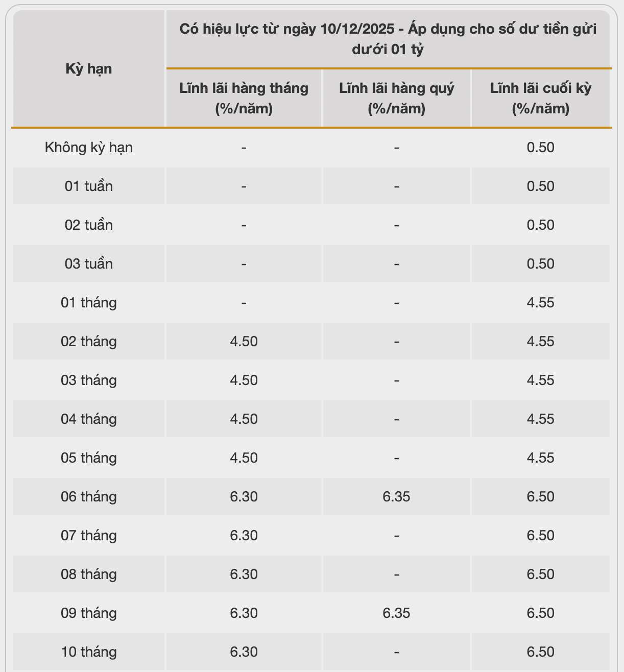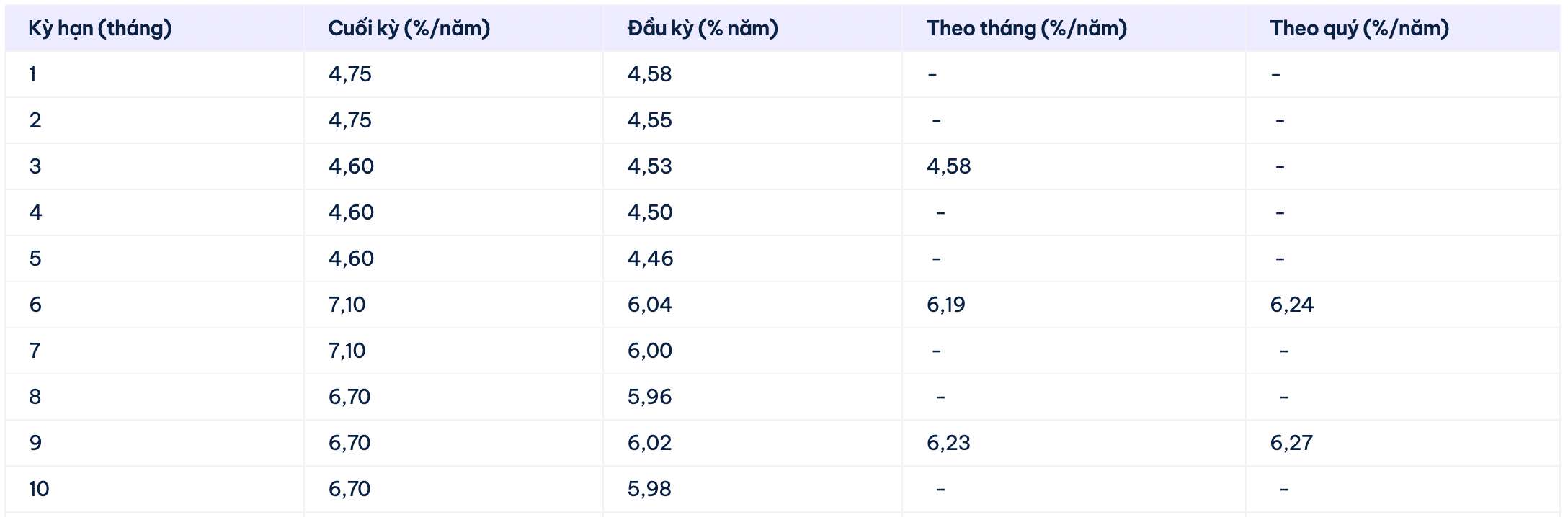 Vikki Bank is listing the highest interest rate for 13-month deposits at 6.7%/year when customers deposit money online and receive interest at the end of the term. For other terms, customers list interest rates at 0.5-6.7%/year.