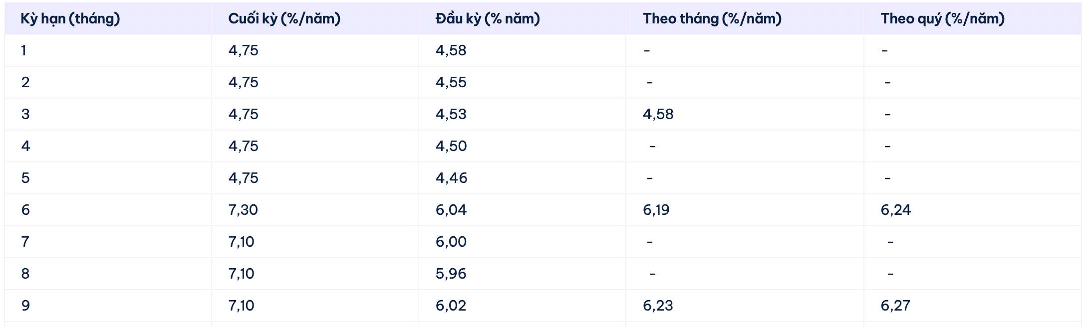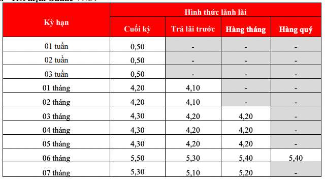 Cake by VPBank is listing the highest interest rate for a 12-month term at 7.1%/year when customers receive interest at the end of the term. Customers receiving interest at the beginning of the term, by month, by quarter receive interest rates of: 6%; 6.27%; 6.31% respectively. Currently, Cake by VPBank lists the highest interest rate of 7.3% for a 6-month term.
