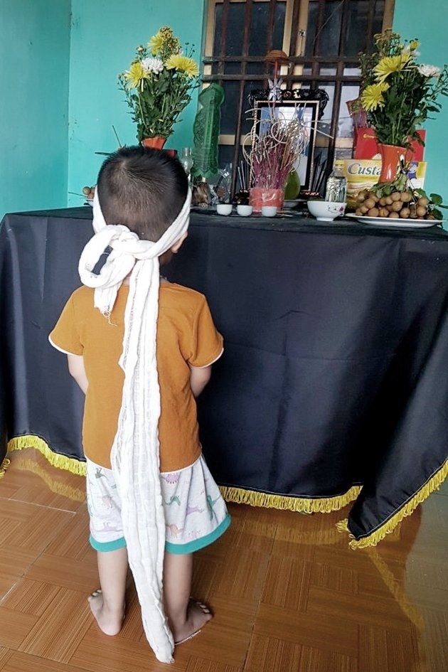 LD 21198: Xót thương bé 3 tuổi đeo khăn tang khóc ròng đòi bố mẹ trở về