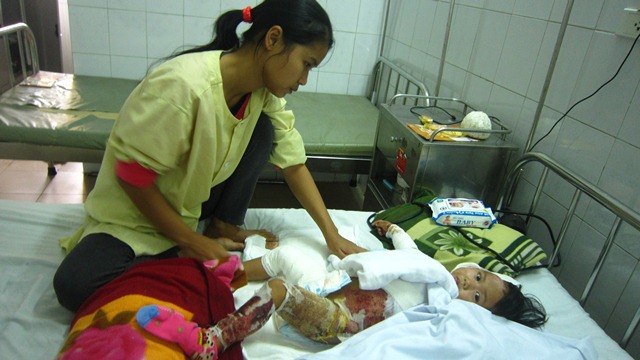 Mới được 20 tháng tuổi, cháu Đỗ Minh Châu đã bị cả nồi nước đang sôi trên bếp đổ vào người, dẫn đến bị bỏng nặng với độ sâu 30% diện tích cơ thể, cấp độ II, III.