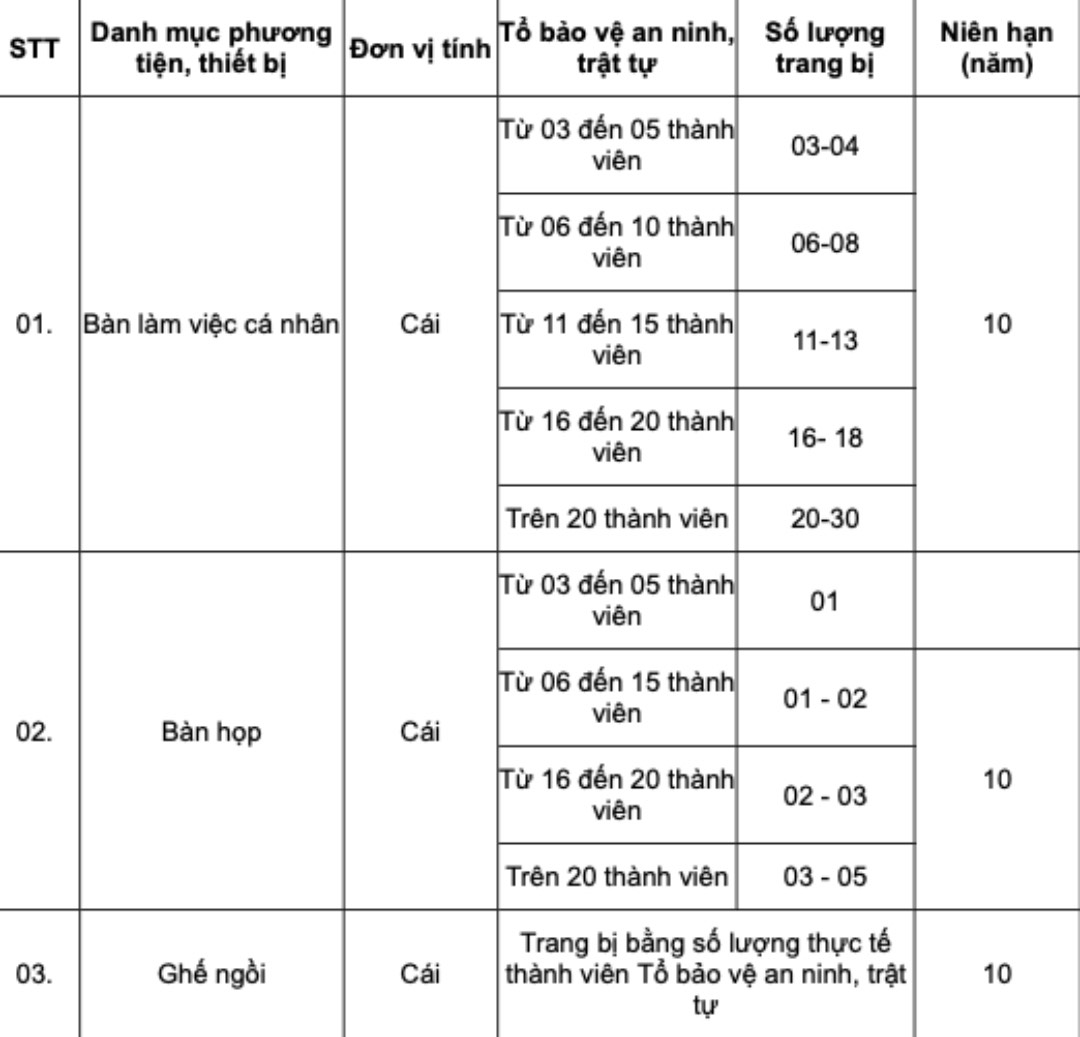 Thus, the security and order protection team with 16-20 members will be equipped with 16-18 individual desks; 2-3 meeting rooms; 16-20 seats; 6-10 cabinets containing documents, supporting and serving work tools; 8-9 personal beds; office supplies according to work requirements.