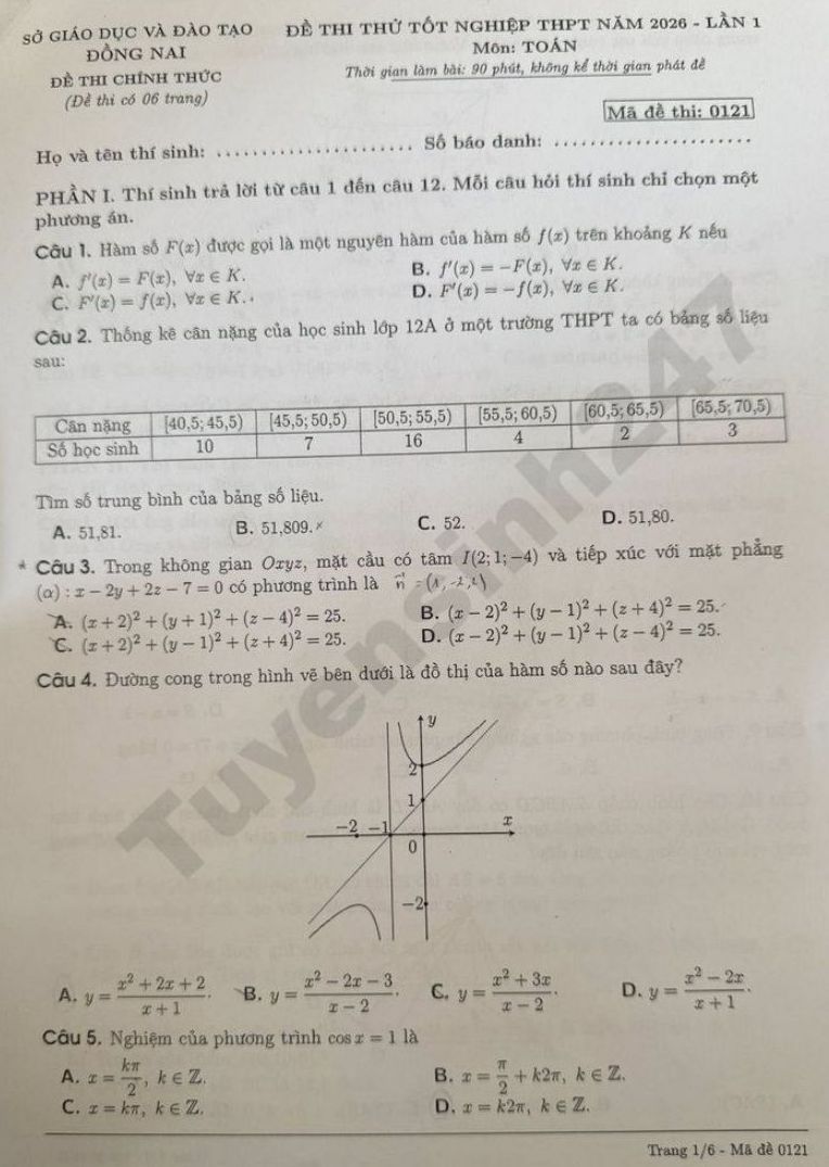 Math mock exam for high school graduation 2026 - Dong Nai Department of Education and Training (1st time)