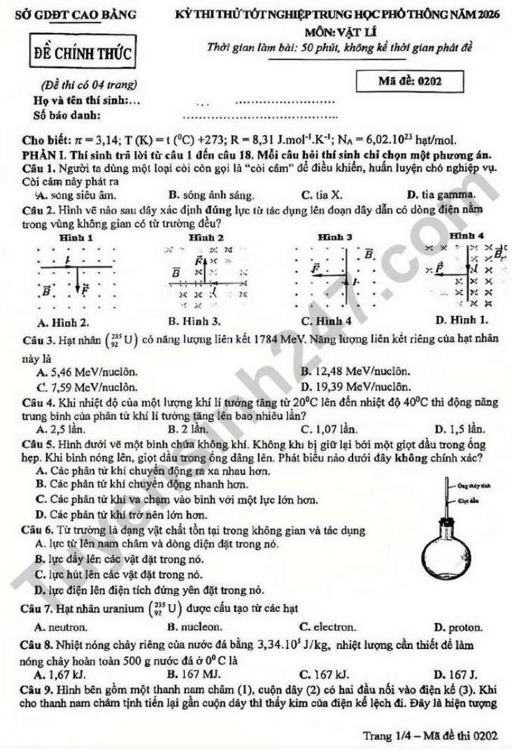 2026 High School Graduation Physics mock exam - Cao Bang Department of Education and Training