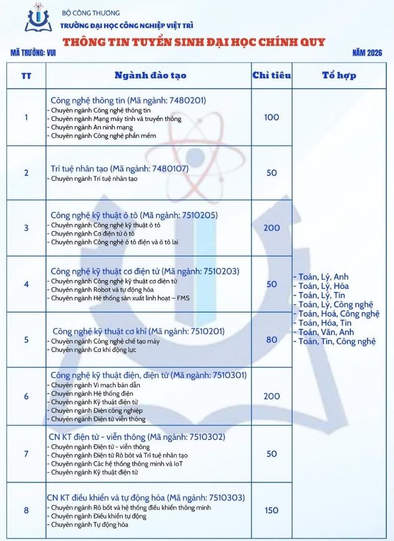 Viet Tri University of Industry has just announced information on regular university admissions in 2026. Accordingly, the admission methods are as follows: