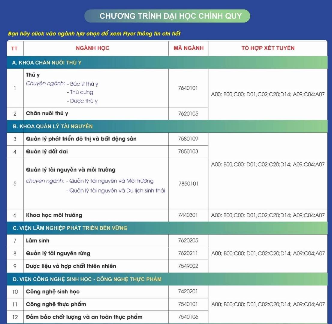The list of admission combinations used by the University of Agriculture and Forestry - Thai Nguyen University in the 2026 admission season is as follows: A00, A01, C00, C01, C02, D01, D07...