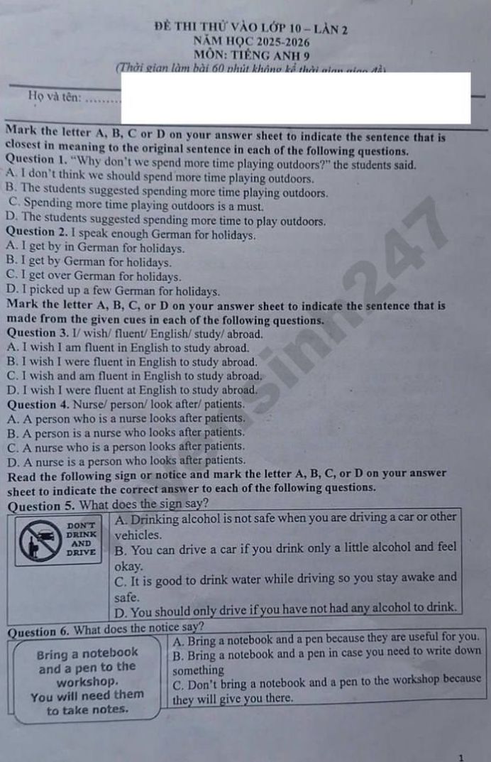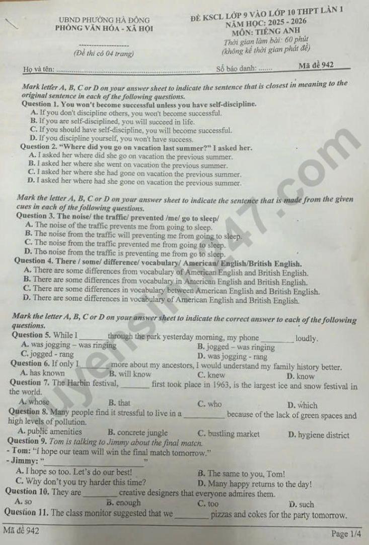 10th grade English mock exam for the 2025 - 2026 school year - Ha Dong ward (1st time)