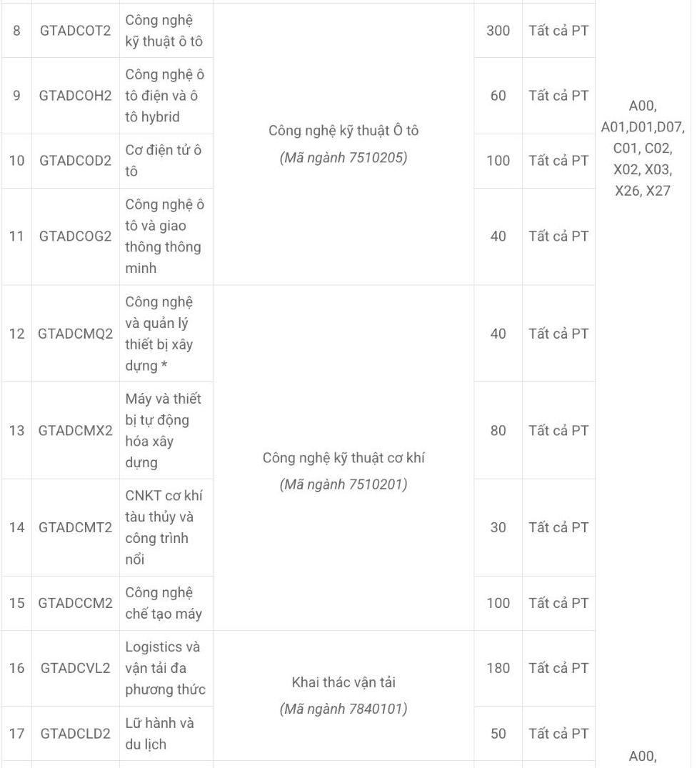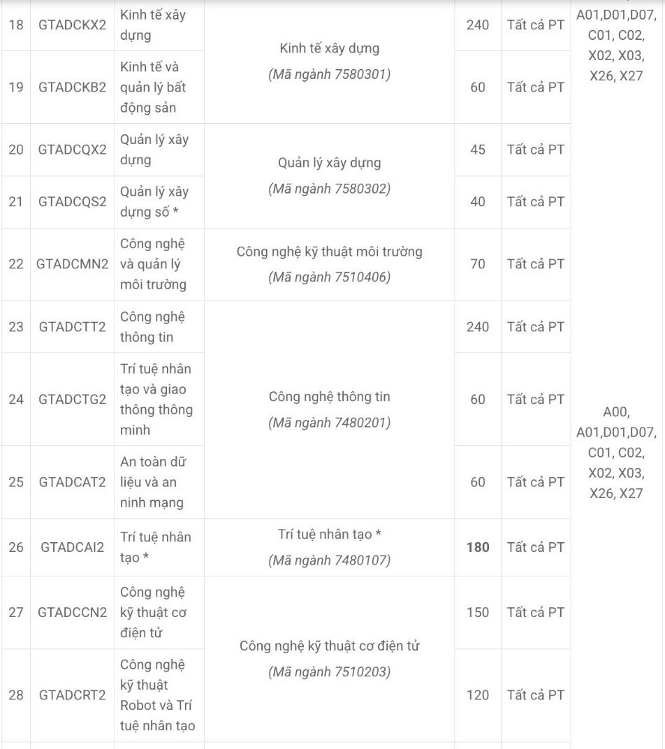 For the University of Transport Technology, some training majors are considered for admission using the D07 combination (Math, Chemistry, English) such as: Transport Engineering Technology, Construction Engineering Technology, Automotive Engineering Technology, Mechanical Engineering Technology, Construction Economics, Environmental Engineering Technology, Mechatronics Engineering Technology, Information Technology...