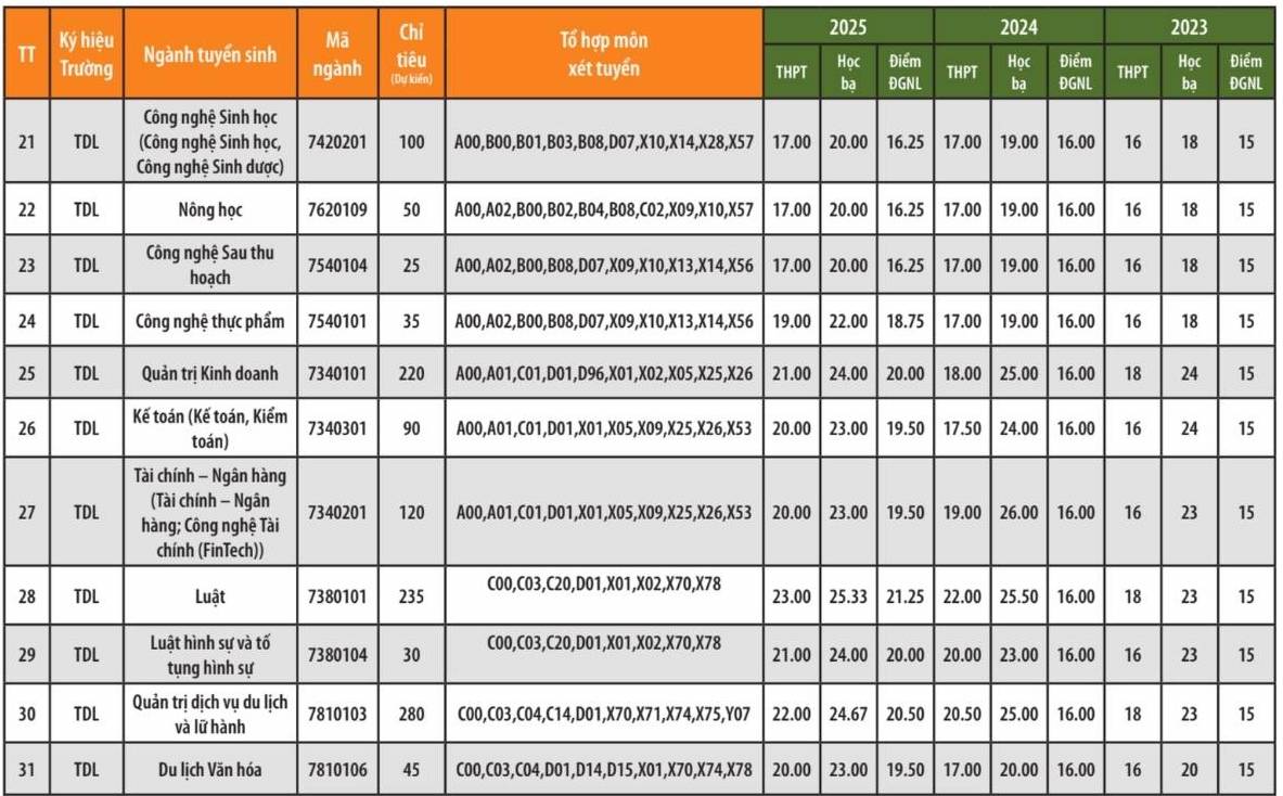 In 2025, the admission benchmark score to Da Lat University according to the high school graduation exam score method ranges from 16 to 28.5 points.