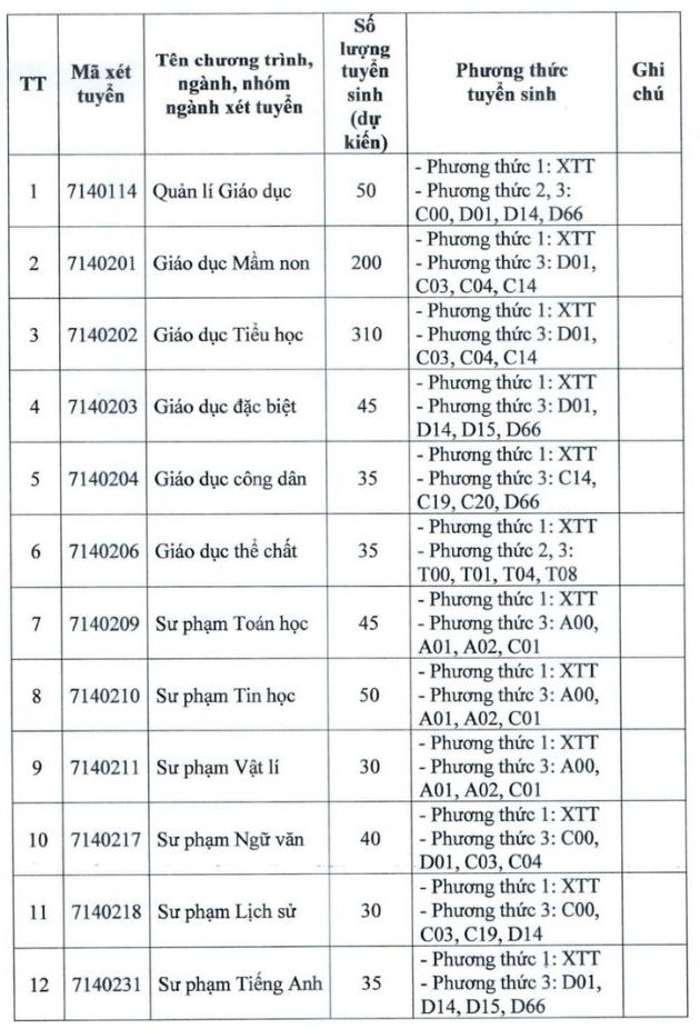 Regarding enrollment quotas, the school plans to recruit 200 quotas for Preschool Education, 310 quotas for Primary Education, 45 quotas for Mathematics Pedagogy, 50 quotas for Informatics Pedagogy, 30 quotas for Physics Pedagogy, 40 quotas for Literature Pedagogy, 30 quotas for History Pedagogy...