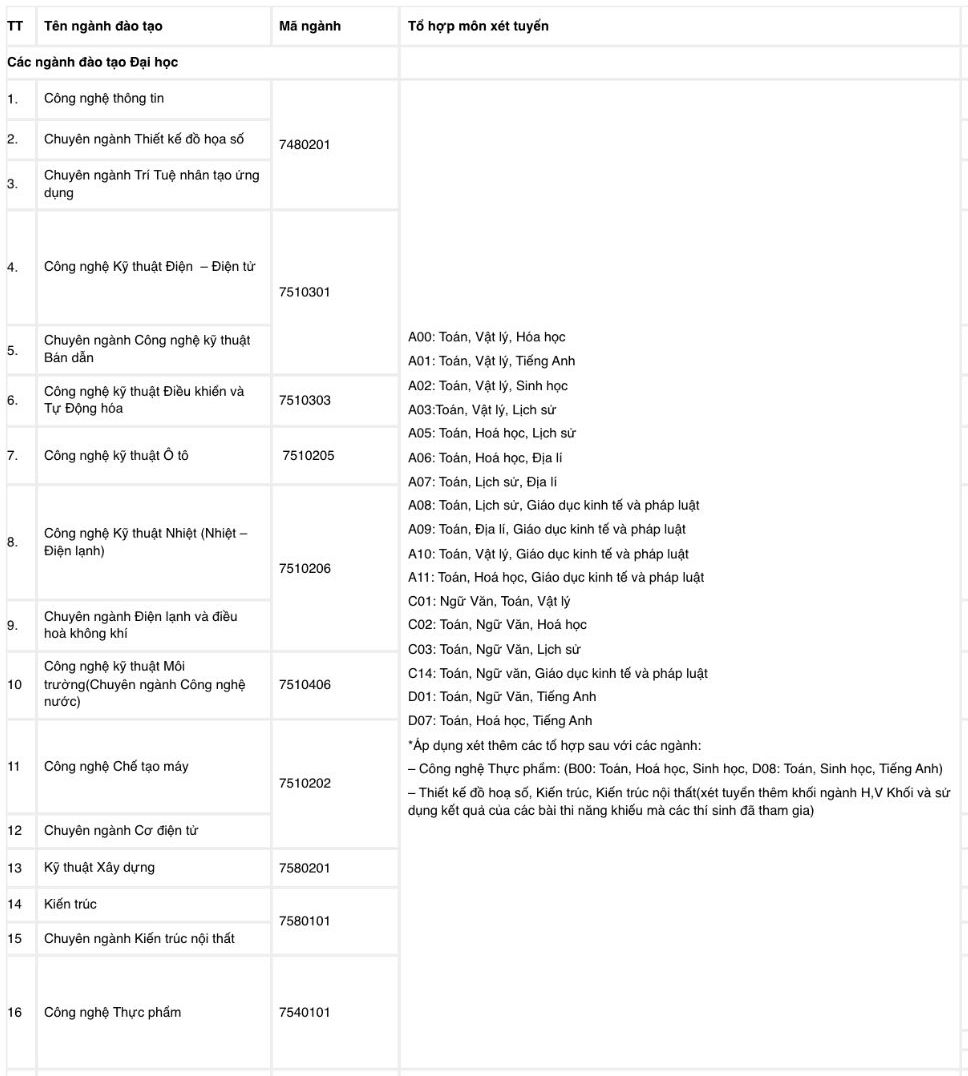 List of admission combinations used by Dong A University of Technology in the 2026 enrollment season as follows: A00, A01, B00, B03, B04, B08, C00, C01, D01, D07...