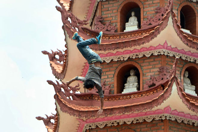 | Lê Thọ Trường sau khi dùng ma tuý đá đã nhảy từ đỉnh toà tháp tại chùa Cót (Hà Nội) xuống. Ảnh: TIẾN TUẤN |