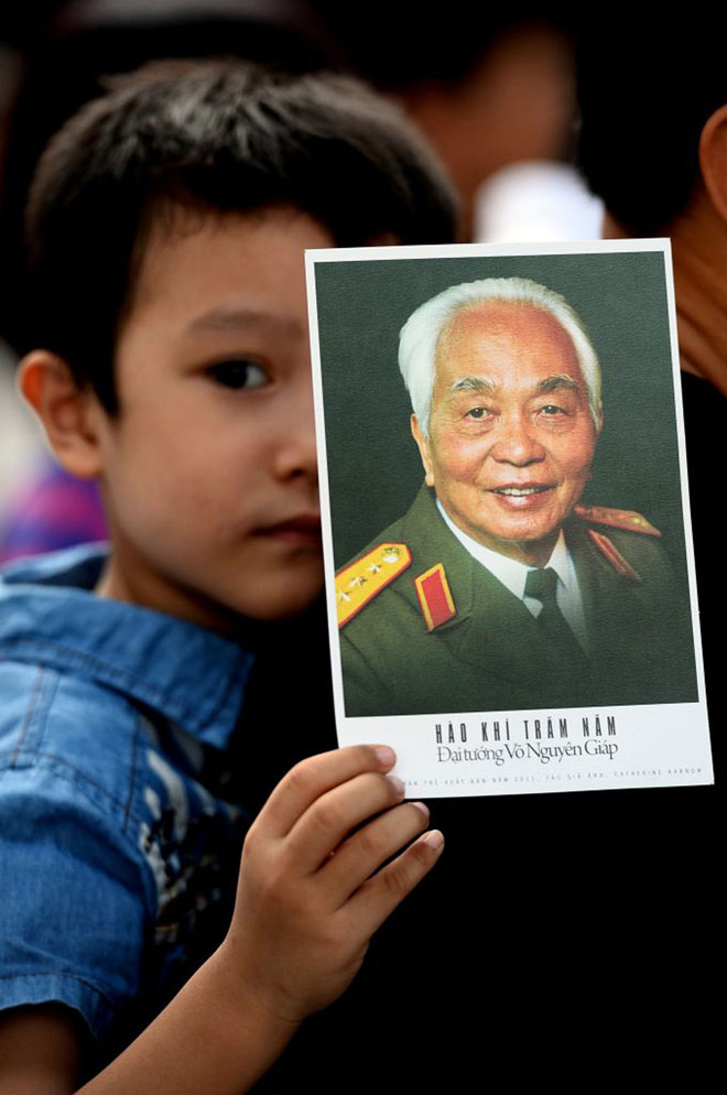 | Em bé trên lưng người thân viếng Đại tướng Võ Nguyên Giáp, tháng 10.2013. Ảnh: HOÀNG HÀ |
