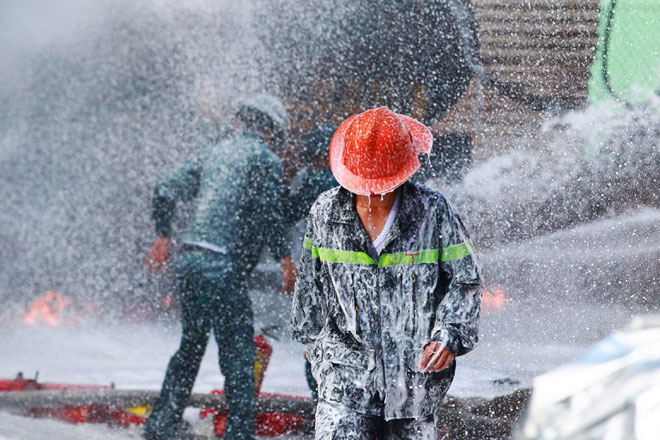 | Một lính cứu hỏa tại cây xăng 2B Trần Hưng Đạo (chụp ngày 3.6.2013). Ảnh: NGUYỄN KHÁNH |