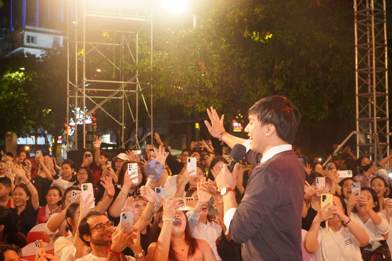 In the seats below, the cast of the movie "Red Rain" excitedly joined in the vibrant atmosphere, continuously applauding in cheers. The image of the artist on the rain-wed stage, the audience in the stands still patiently standing and listening, created one of the most emotional moments of the music night.