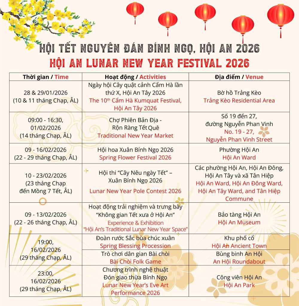 In the atmosphere of welcoming Binh Ngo Spring and celebrating the founding day of the Communist Party of Vietnam, Hoi An organizes a series of unique cultural and tourism activities named "Binh Ngo Lunar New Year 2026 Festival". The event takes place throughout from mid-December to the end of the first lunar month, to honor the value of traditional Tet, preserve cultural heritage and serve the spring joy needs of people and tourists in the Hoi An Creative Heritage City space.