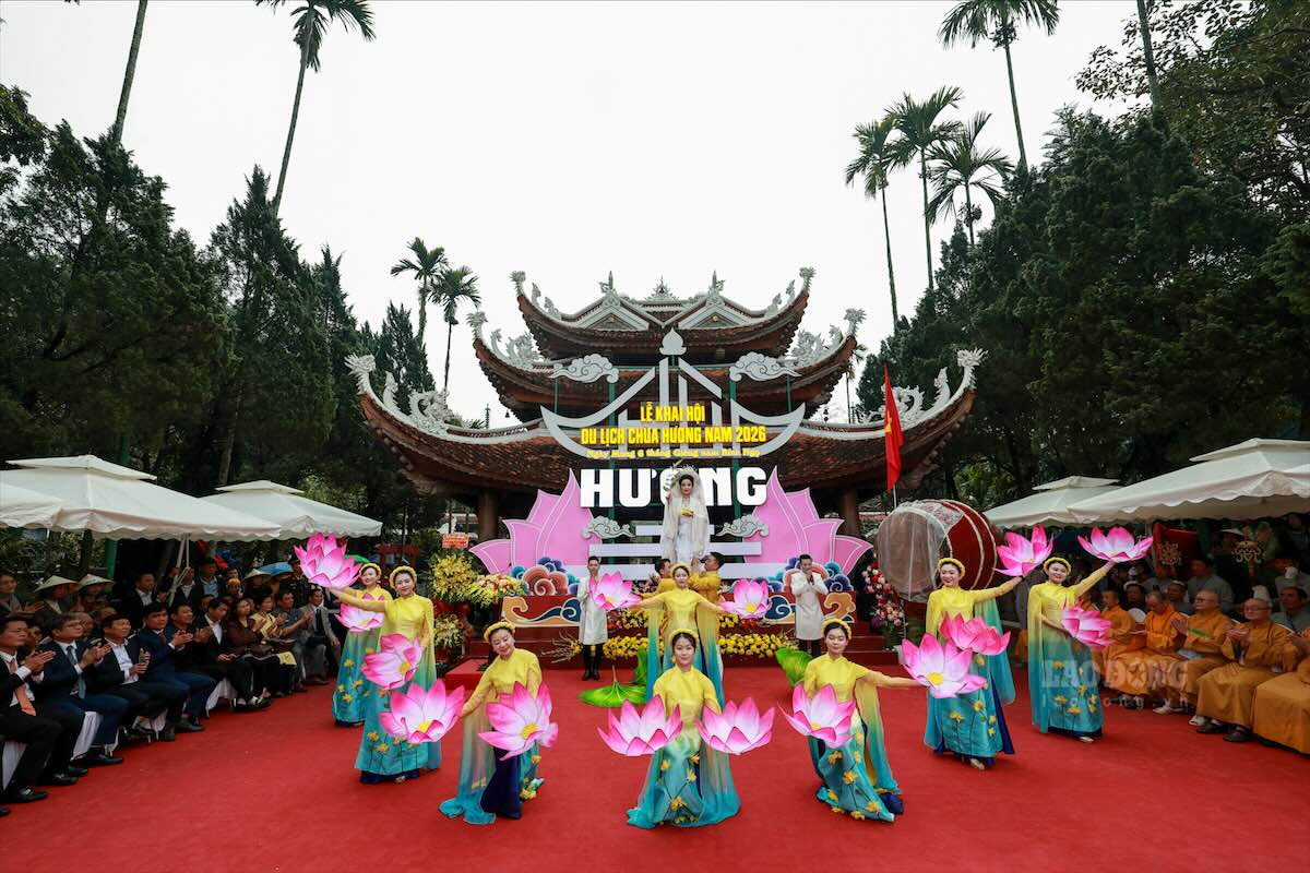 The opening ceremony of the Perfume Pagoda festival took place at 8:30 am. Speaking at the ceremony, Chairman of Huong Son Commune People's Committee Le Van Trang said that this year's festival is organized in an innovative direction, focusing on safety, friendliness and improving service quality, while creating a sustainable development foundation for the relic site. Huong Son identifies cultural tourism development as a key task, aiming to build a civilized and modern locality, making tourism a key economic sector.