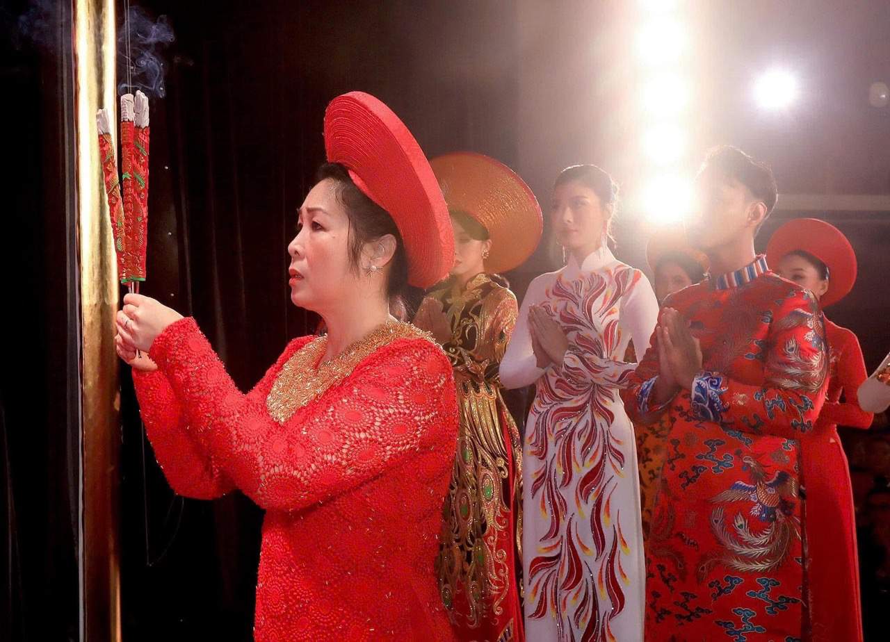 At Hong Van stage, the female People's Artist and her students also prepared a solemn offering tray. The female artist put other artistic activities on hold to focus on her father's death anniversary.