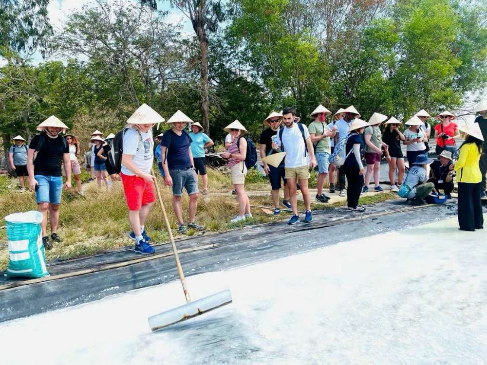 Ms. Ngoc Suong, a pioneer tour guide, shared while guiding visitors to experience the salt fields: "Instead of just standing and watching, visitors can directly scrap salt, carry salt, and taste the salty and salty taste of the sea. From a village guide, I now have an additional job as a tour guide. Life is much happier and more bustling thanks to that, and my income has also improved significantly".