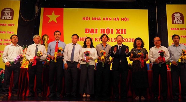 | Ban chấp hành Hội Nhà văn Hà Nội khóa mới nhận hoa từ các lãnh đạo TP. Hà Nội và ra mắt hội viên. Ảnh: BH |