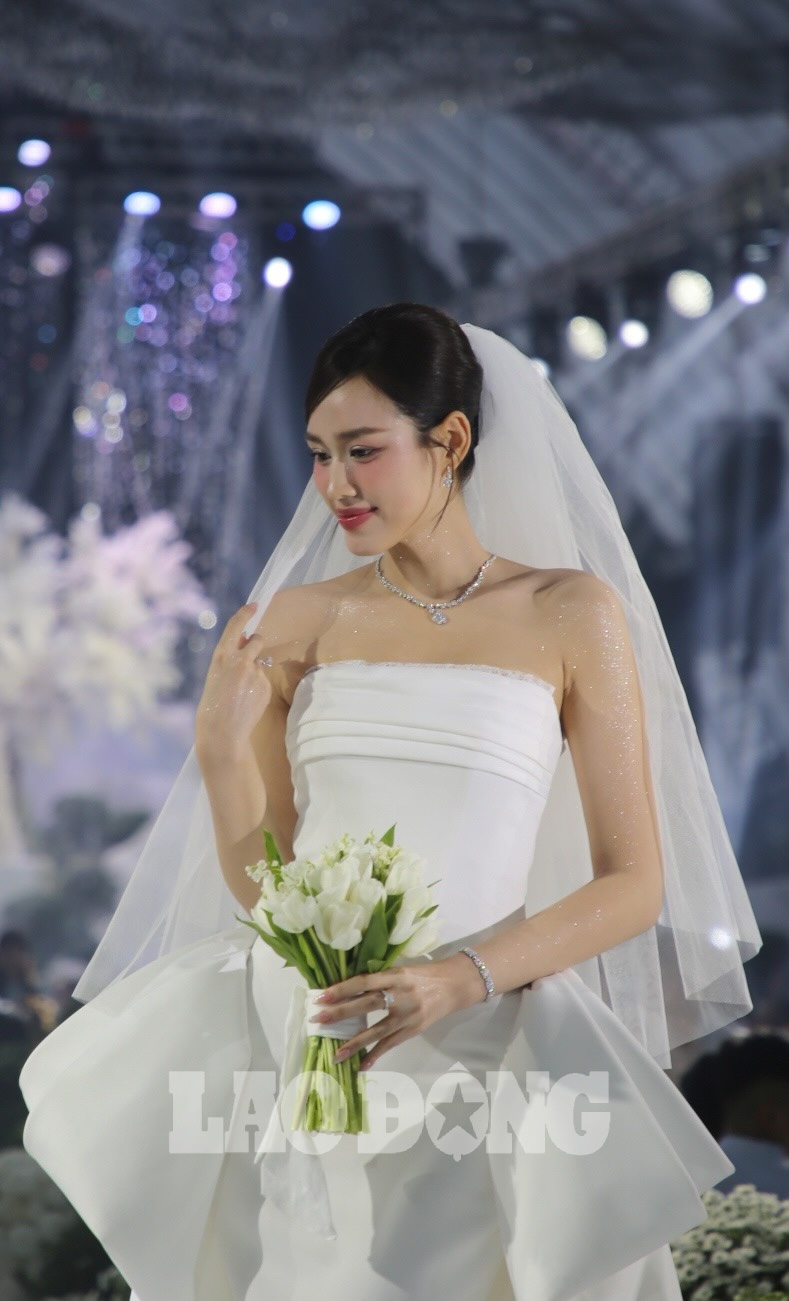 The wedding space is luxuriously designed, with a view of the Nhat Le River, with the main color of white, the sparkle of fresh flowers and sparkling lights. From 4:30 p.m., guests began to arrive, the solemn and cozy atmosphere filled with laughter and blessings.