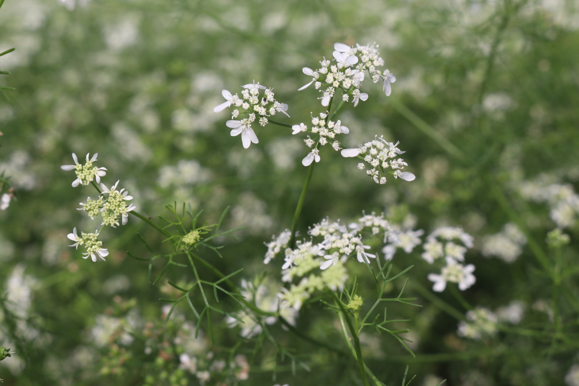 The old coriander plant is slender, the leaves are no longer as large as tamarind leaves but are pointed and needle-shaped. The old coriander stem is as big as an incense stick and grows to about half a meter in height. On the stem hang clusters of round fruits, as big as peppercorns, with umbrella-shaped flowers blooming at the top.