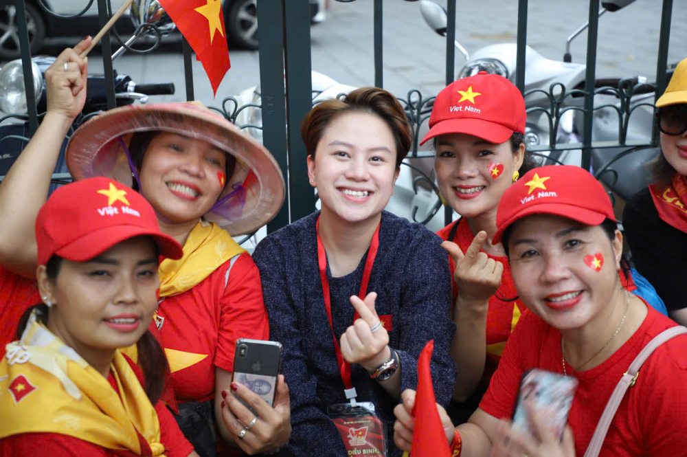 Miss Do My Linh and Quynh Anh - wife of midfielder Duy Manh gave food to people watching the preliminary parade and parade in the Nguyen Thai Hoc street area.