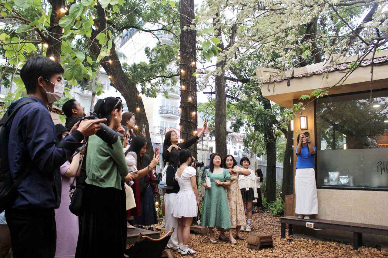 Hanoi - The blooming evergreen flower at the coffee shop on Ngoc Ha Street (Ba Dinh District) is attracting a large number of people to admire and take photos from morning to afternoon.