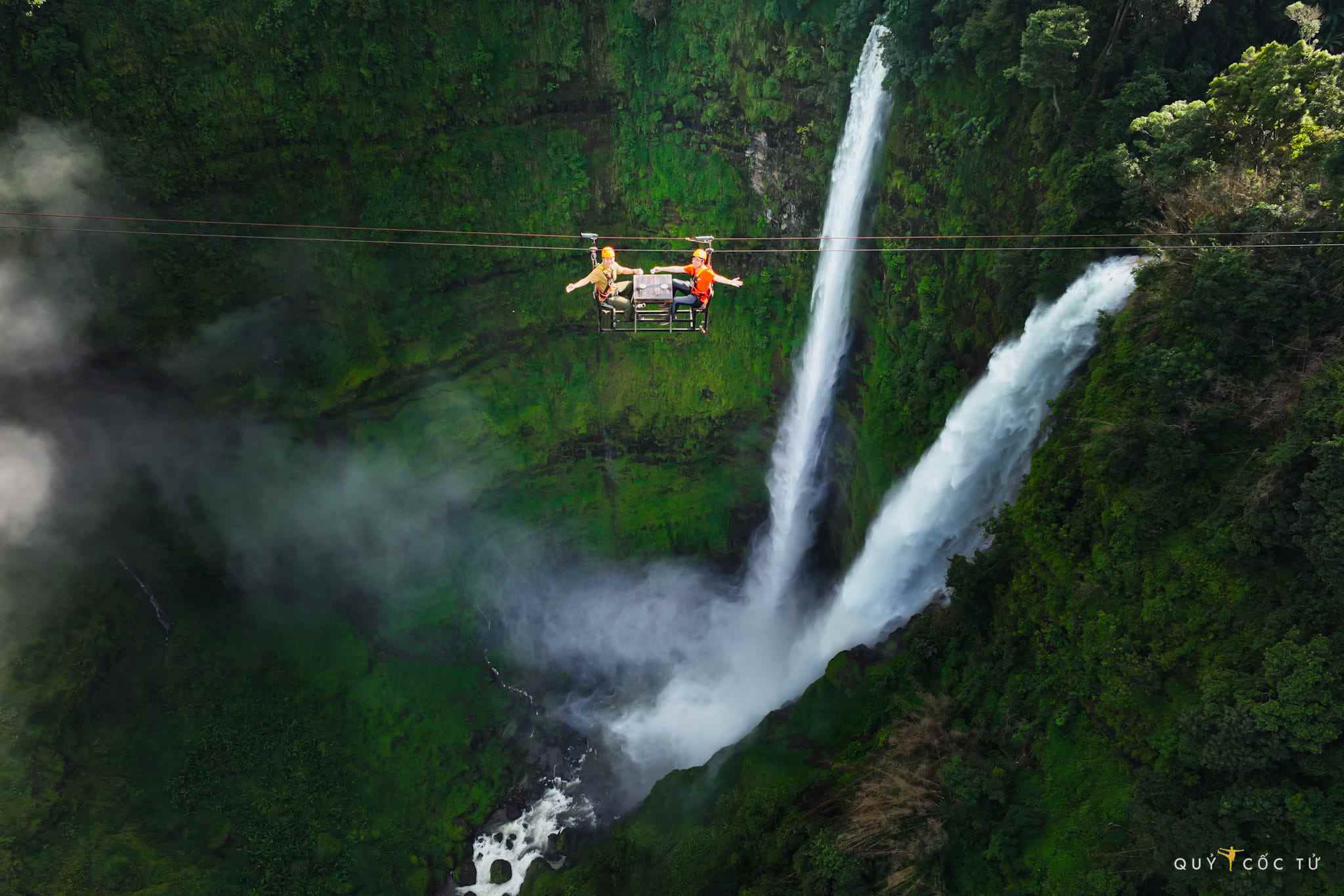 Vietnamese tourists shiver as they drink coffee in the middle of a 200m high waterfall in Laos