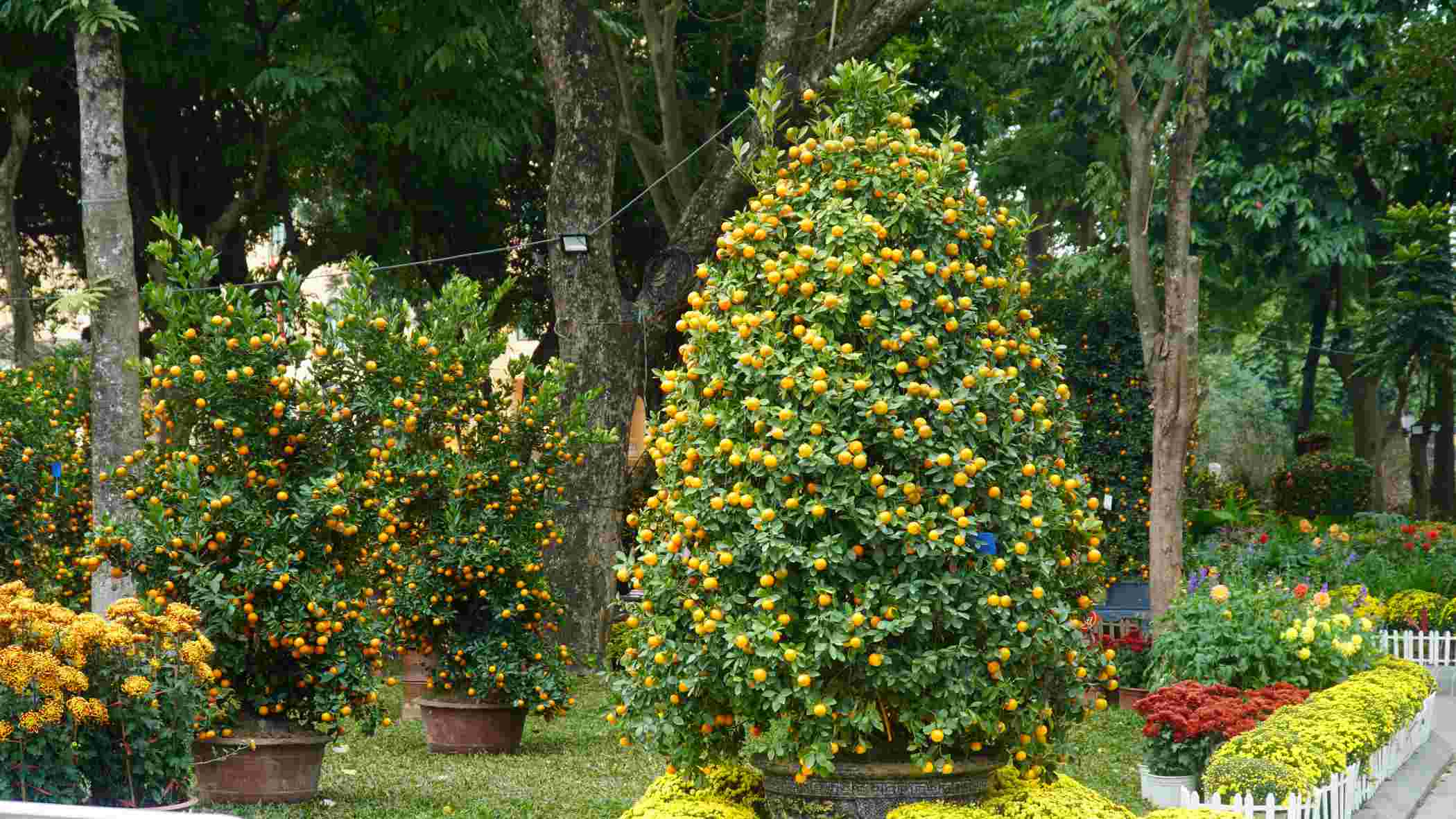 More than 300 peach trees from ancient trees, artistic shaped trees to natural trees are arranged alternately, creating a brilliant pink space. Besides, there are nearly 300 ornamental kumquat trees, artistic shaped kumquat trees are elaborately arranged, attracting attention from afar. Trees with unique straight, horizontal, and huyền shapes become an ideal "backdrop" for people to preserve the first moments of spring.