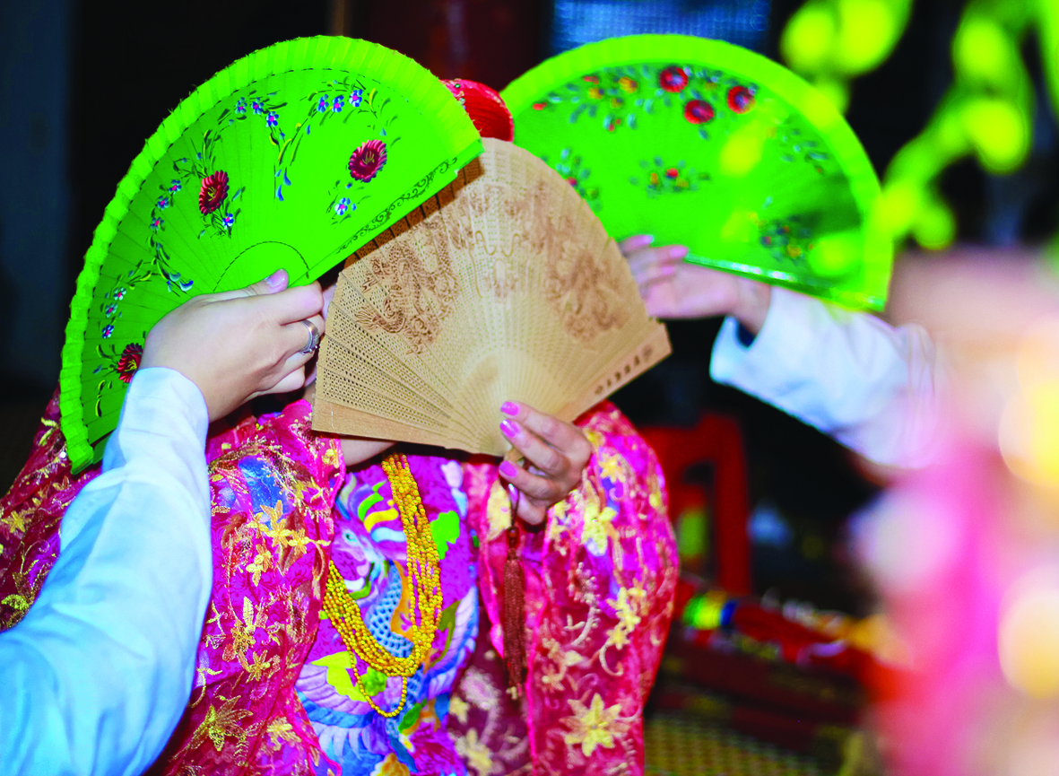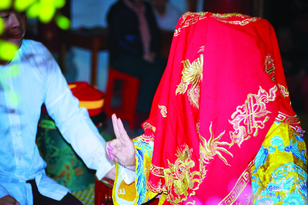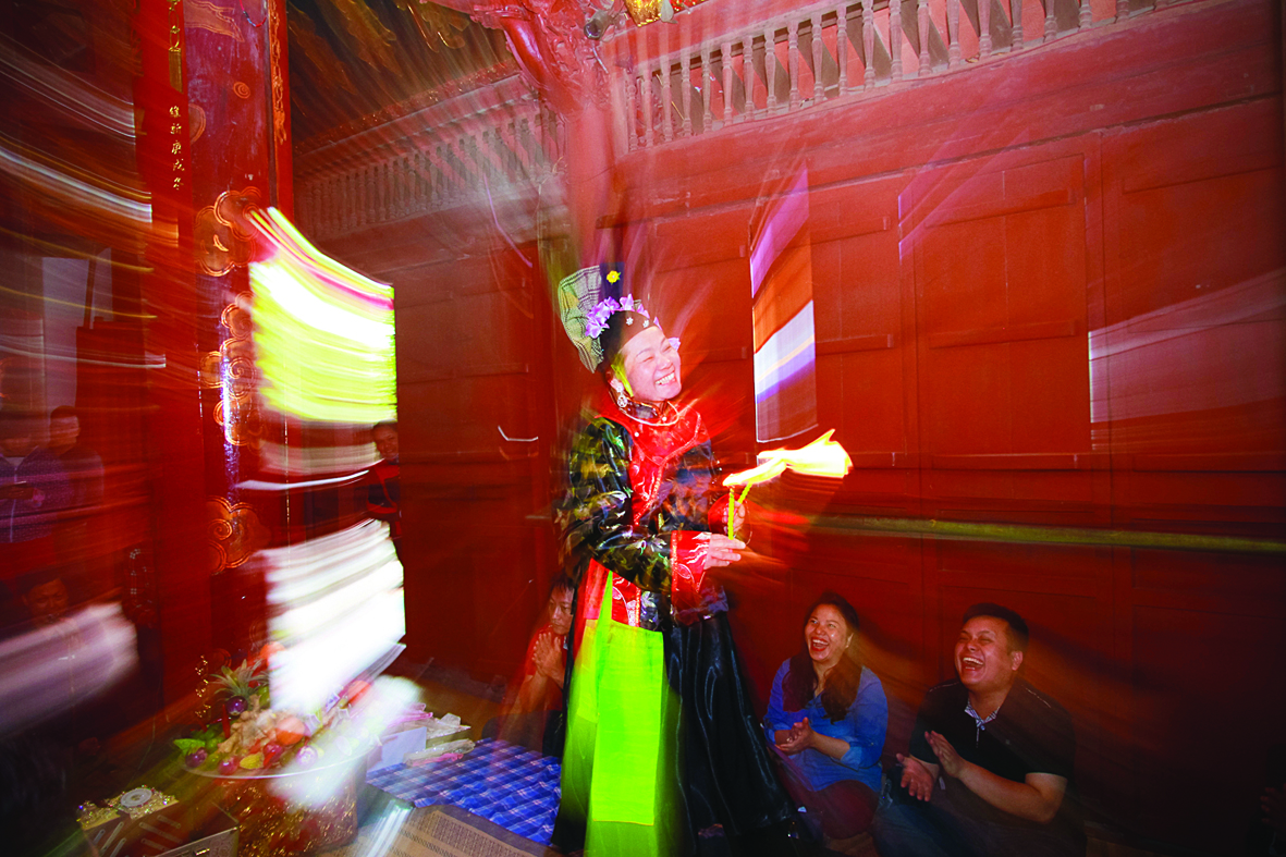 | Trong ảnh, động tác se giá sau khi hết 1 giá hầu để chuyển sang giá khác. Động tác trùm khăn và giơ 2 ngón tay trái để chuyển sang giá Cô Đôi Thượng ngàn mở phủ và hầu đồng. |