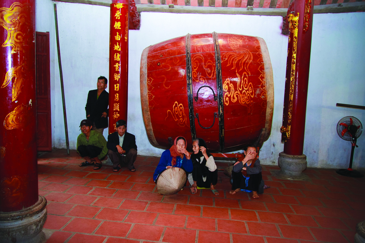 Các thanh đồng thường hầu thông đêm đến sáng và có rất nhiều người dân địa phương thường hay lui đến cửa thánh để xem hầu và chủ yếu là xin lộc. Trong ảnh, một số người già trực bên cung công đồng để chờ cô đồng ban lộc tại phủ Vân Cát. |