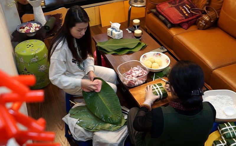 The family of Mrs. Tran Thi Bich Hang (Ngoc Khanh, Ba Dinh, Hanoi) has preserved the traditional custom of wrapping Chung cakes for Tet for many years.