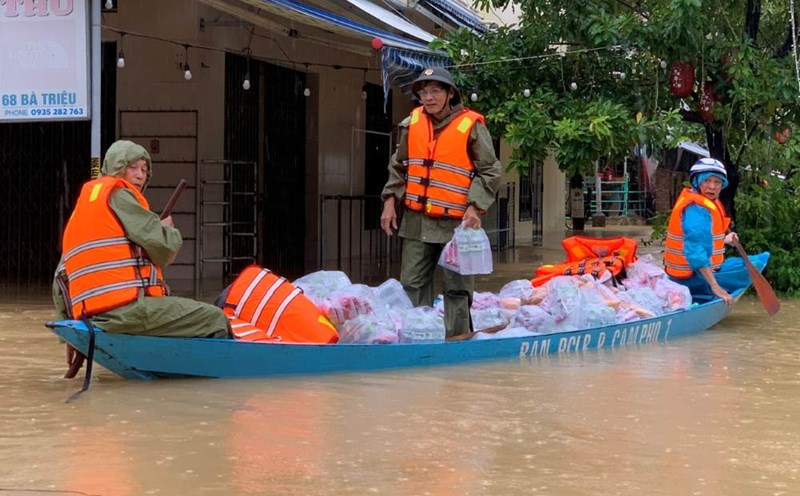Da Nang - Floodwaters surrounded many areas in Hoi An, authorities rowed boats to provide food to people.