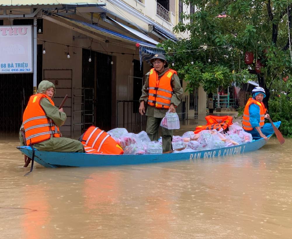 Da Nang - Floodwaters surrounded many areas in Hoi An, authorities rowed boats to provide food to people.