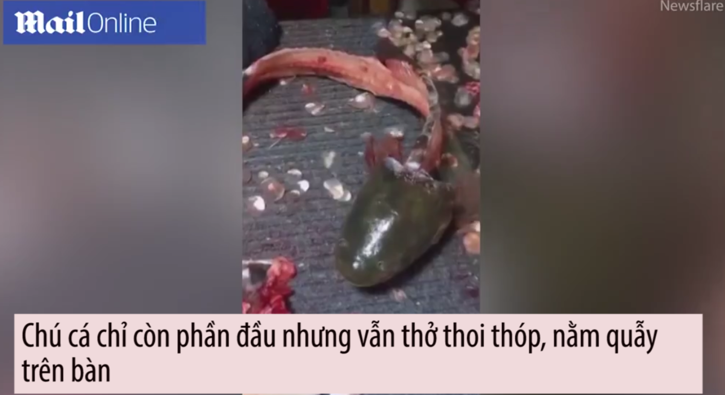Trên trang Daily Mail mới đây có đăng tải một đoạn ghi lại cảnh chú cá chỉ còn phần đầu nhưng vẫn thở thoi thóp, nằm quẫy trên bàn. Được biết, đoạn clip trên được quay vào tháng trước tại thành phố Thành Đô, tỉnh Tứ Xuyên, Trung Quốc. Chỉ ít lâu sau khi xuất hiện, những hình ảnh trong đoạn clip đã được các cư dân mạng mang ra "mổ xẻ". Đại đa số người xem đều tỏ ra vô cùng ngạc nhiên trước hình ảnh kỳ lạ này.