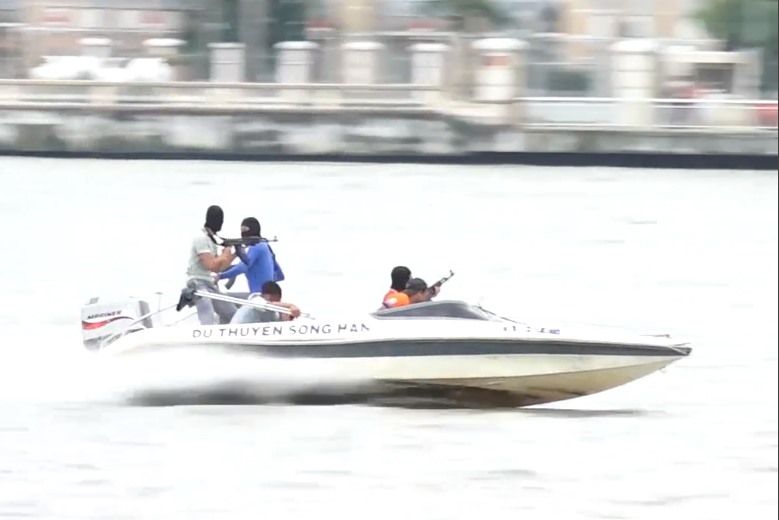 Tình huống giả định là nhóm khủng bố bắt cóc con tin, chiếm giữ một tàu du lịch trên sông Hàn và yêu cầu công an phải đưa hai triệu USD mới chịu thả người.