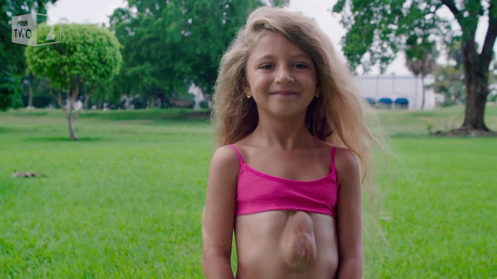 Cô bé Visaviya Borun, 7 tuổi đến từ Florida mắc hội chứng bẩm sinh khiến trái tim gần như nằm ngoài lồng ngực, thậm chí có thể chạm tay vào.