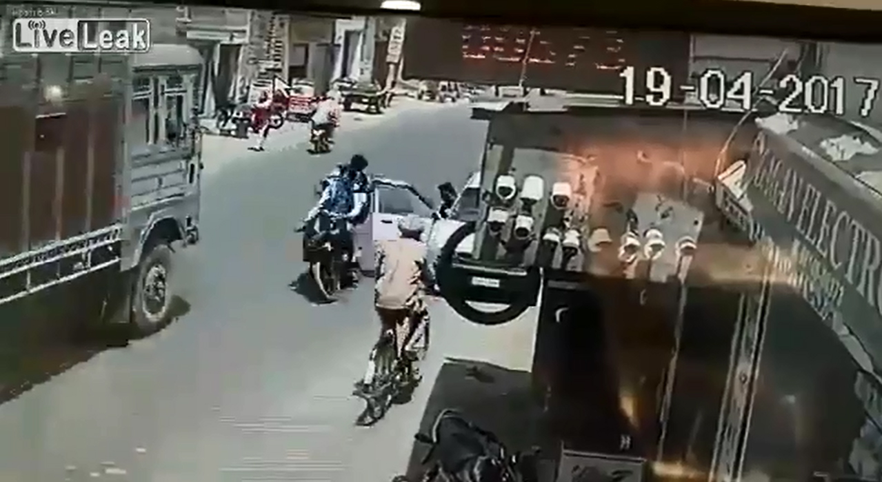 Ô tô con đỗ ven đường mở cửa bất cẩn khiến hai nam sinh trên xe máy ngã văng, đúng lúc xe tải lao tới cán qua khiến hai em thiệt mạng. Vụ tai nạn xảy ra hôm 19.4 tại bang Punjab, Ấn Độ.