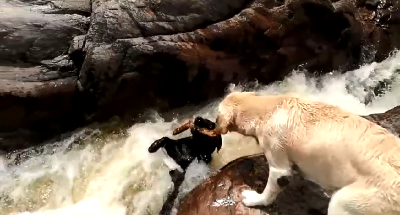 Khi nhìn thấy bạn của mình gặp khó khăn và nguy hiểm giữa dòng nước chảy xiết, chú chó đã kéo bạn của mình lên bờ. Đoạn clip đã lập tức “gây sốt” sau khi được chia sẻ lên Internet.