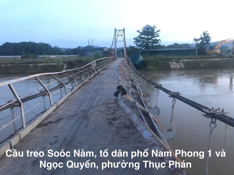 In Tan Giang ward, the two suspension bridges Na Hoang and Na Din were swept away by strong floodwaters, causing the bridge surface to shift, the railing to break, and the cable-stayed bridges to break. Although the main cable is still there, the deterioration poses a high risk of unsafety for travel.