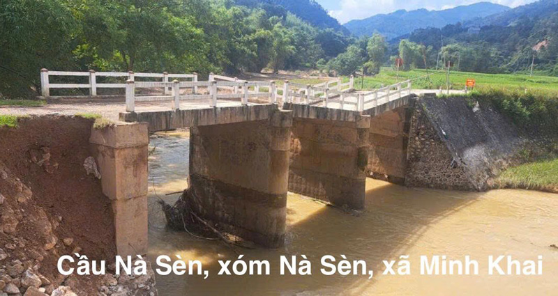 In Minh Khai commune, Khuoi Duoc bridge was completely washed away by floodwaters, while Na Sen bridge was cracked and subsided at the foot of the bridge, making it impossible for traffic. Thong Nong commune recorded 3 damaged bridges: Coc Ca hard bridge collapsed at the bridgehead, Na Leng suspension bridge curved around the railing, threatening the safety of people.