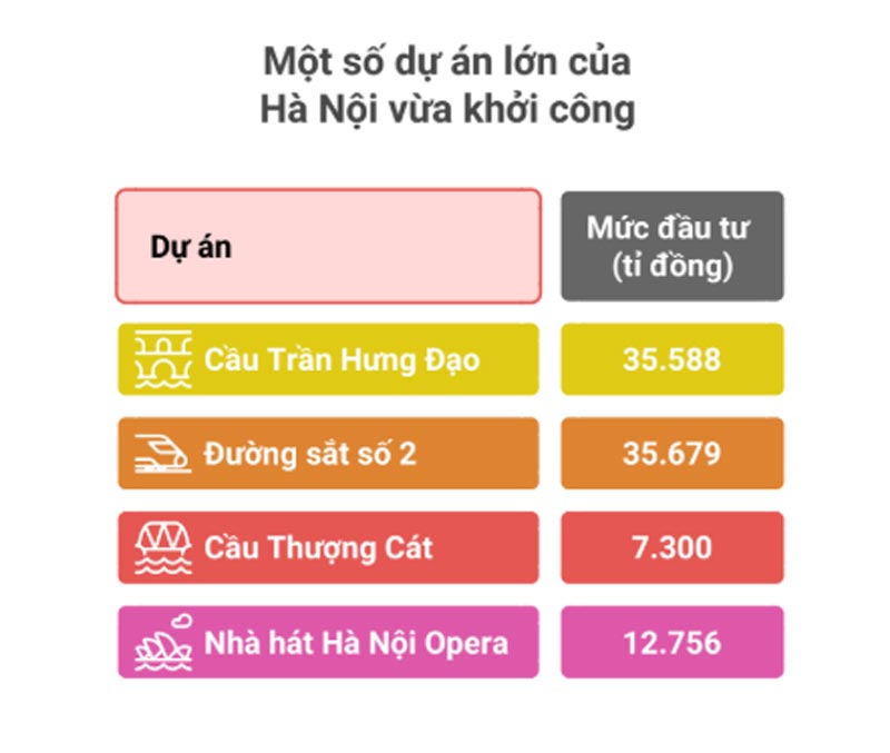 In parallel with the above projects, Hanoi City also organized the groundbreaking of many key projects contributing to changing the appearance of the Capital, including: Investment project to build Le Hong Phong Cadre Training School; investment project to build Hanoi Central Hospital ( facility 2) with a scale of 250 beds; investment project to build Hanoi City Urban Railway Line No. 2, Nam Thang Long - Tran Hung Dao section; compensation, support, resettlement, site clearance project in the group of investment projects to build Hoan Kiem Lake Square - Park; investment project to build Tran Hung Dao bridge, connecting the central area of Hanoi with the East, completing the East - West of the city; investment project to build the bridge at the Linh Linh bridge...