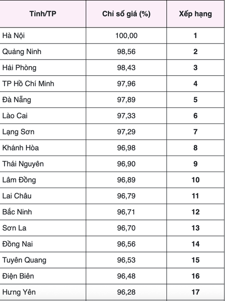 In addition, some other mountainous provinces have "easier" spending levels, such as Lai Chau ranked 11th with an index of 96.79%; Son La ranked 13th with 96.70%; Tuyen Quang ranked 15th with 96.53%; Dien Bien ranked 16th with 96.48%; Phu Tho ranked 23rd with 95.41%; Cao Bang ranked 27th with 94.54% compared to Hanoi.