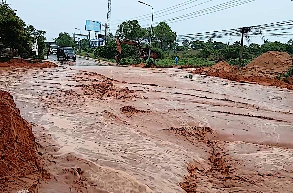 Heavy rain, water from the high hill on Vo Nguyen Giap Street (706B) overflowed, carrying red sand along 706B Street down to Nguyen Thong Street, causing local flooding. The strong flood current carried a large amount of sand onto the road. The cause was that the stormwater drainage system in the area had not been connected to the drainage system of Exit 01, Street 706B, so the overflowing water carried red sand and mud from the high hill down to the lower level.