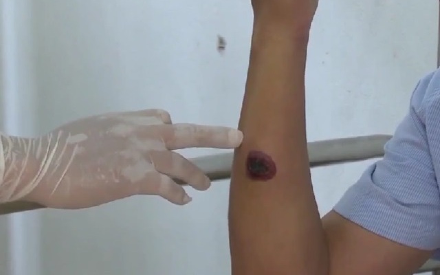 After eating goat meat, on December 17, Mr. V. had a fever, left arm pain, swelling, dark black pimples, and yellow discharge.